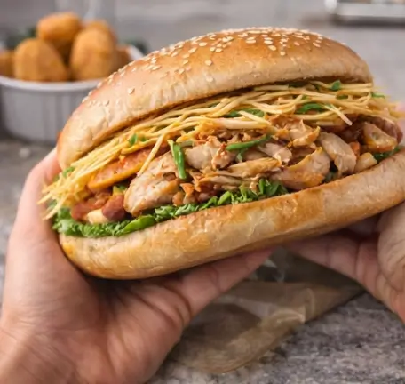 “Frango bem temperado e muito recheado. Sanduíche enorme!